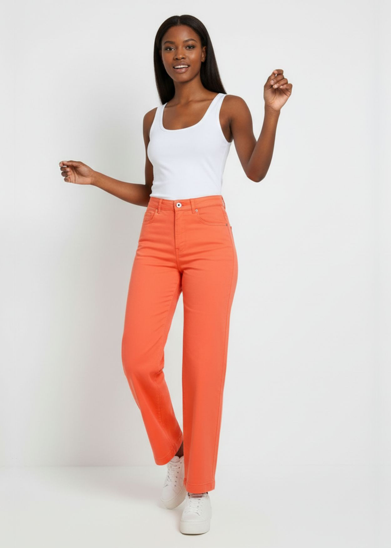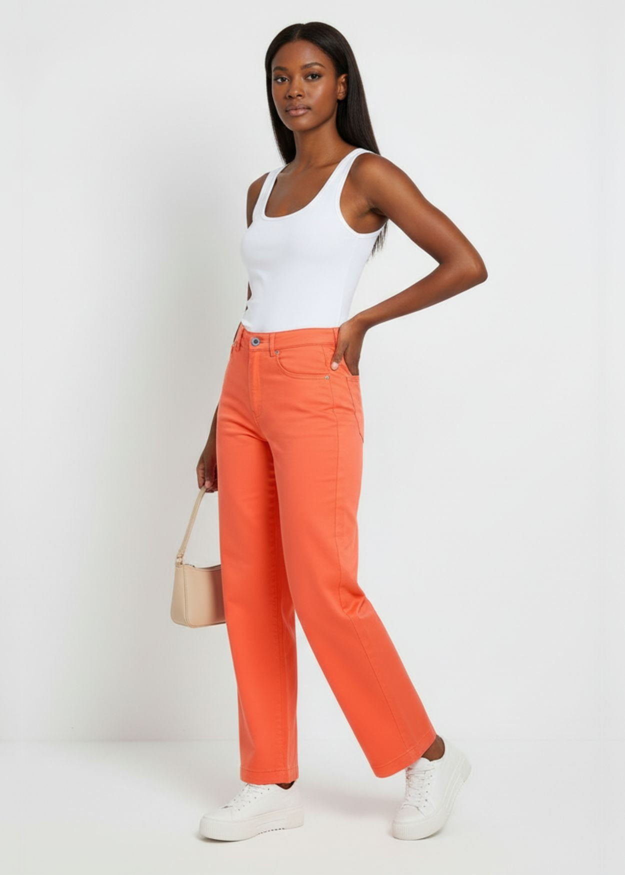 Ce jeans se prête à une multitude d'associations stylistiques selon votre humeur. Pour une allure décontractée et moderne, il s'accorde parfaitement avec un t-shirt blanc basique et des baskets, laissant la couleur orange être la star de votre tenue. Si vous recherchez un style plus habillé pour une soirée ou un événement professionnel, mariez-le à une blouse fluide ou une veste structurée. Les poches pratiques à l'avant et à l'arrière ajoutent une touche fonctionnelle indispensable à cet accessoire de mode, tandis que la fermeture classique par bouton et éclair garantit une utilisation simple et efficace.