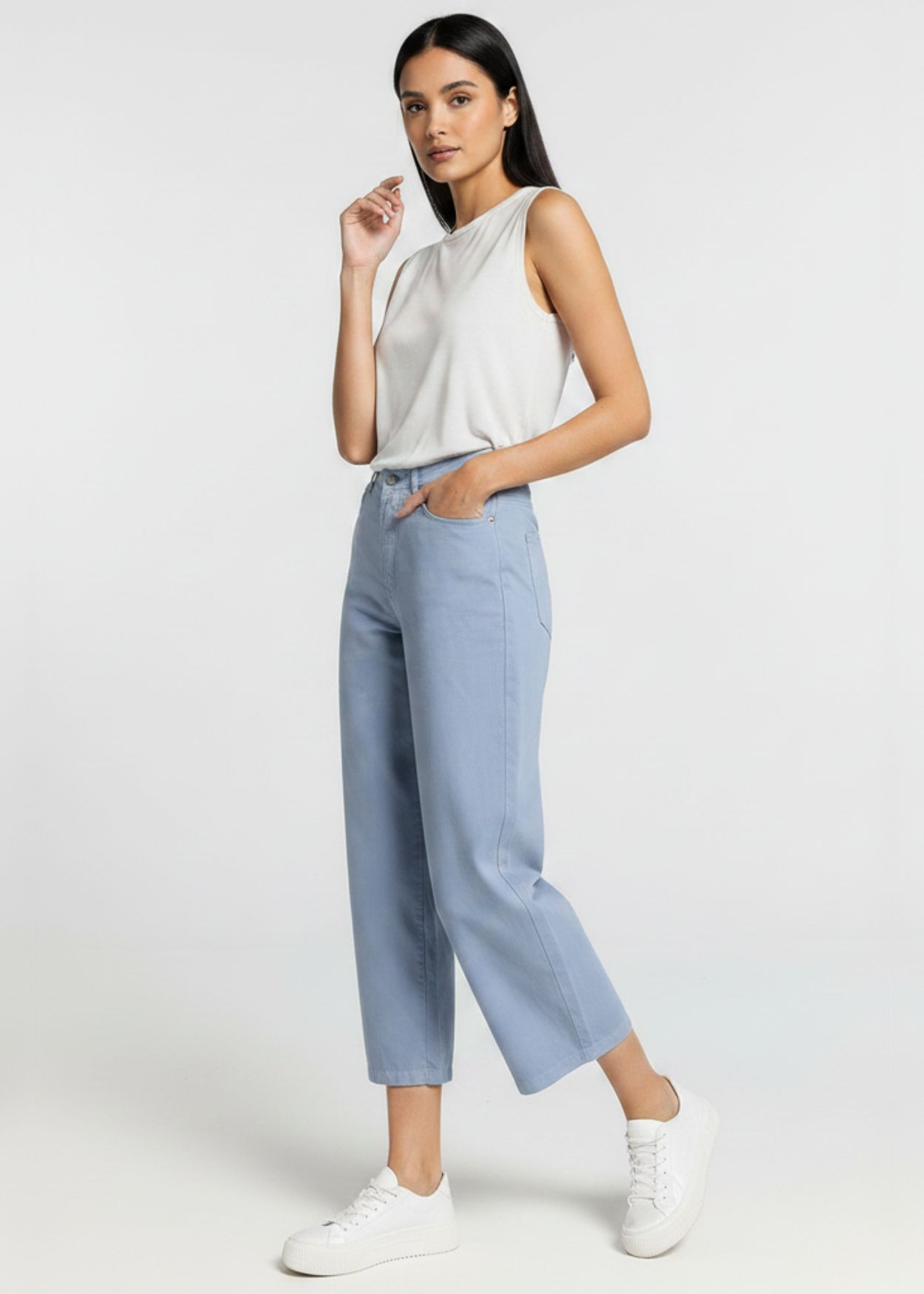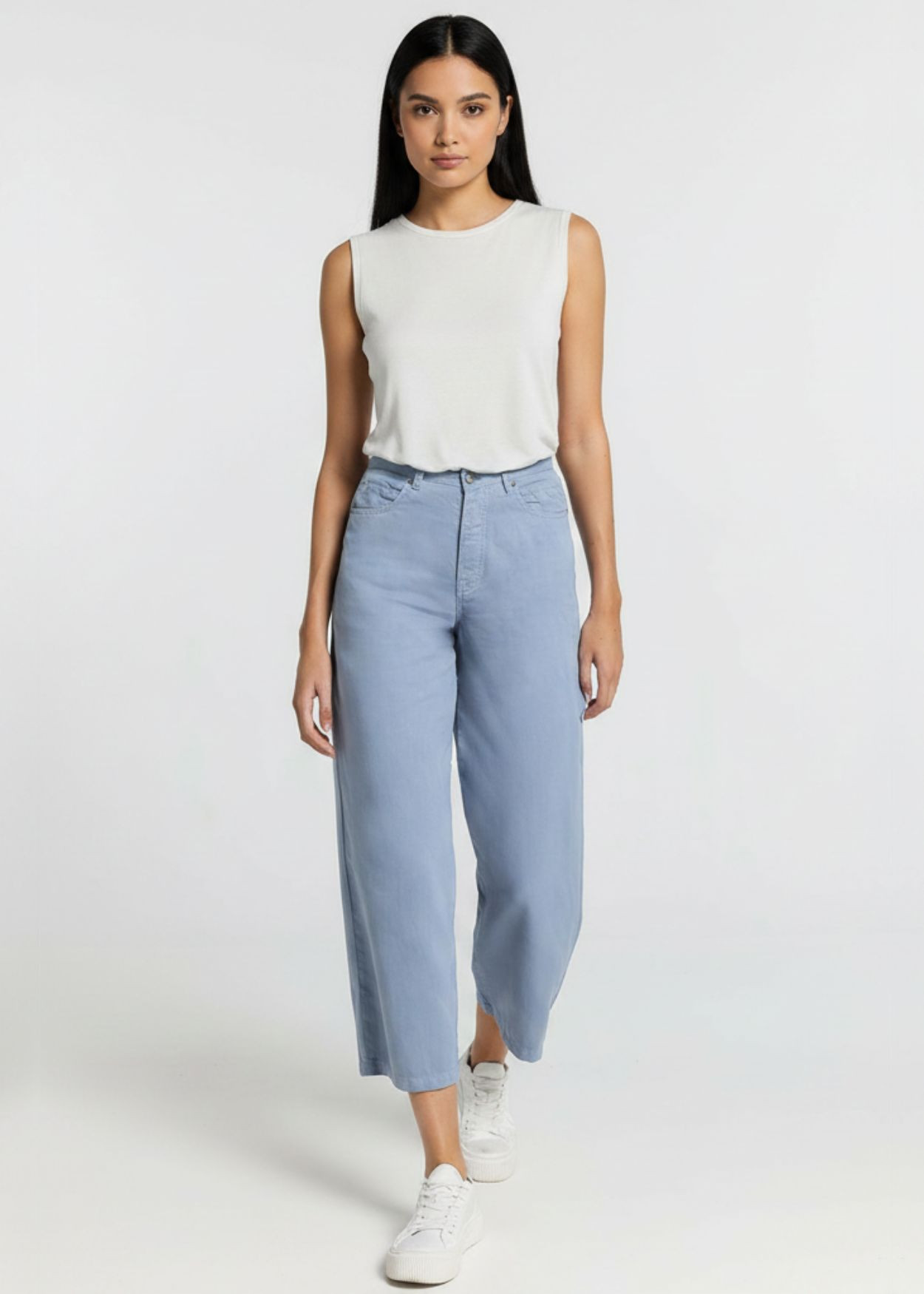 La coupe de ce modèle a été pensée pour sublimer toutes les morphologies avec élégance. Sa taille haute naturelle structure parfaitement la silhouette, marquant la taille tout en assurant un maintien confortable tout au long de la journée. Les jambes larges et évasées apportent une liberté de mouvement absolue, créant une allure aérienne et décontractée. La longueur courte, s'arrêtant juste au-dessus de la cheville, permet de dégager le bas de jambe pour mettre en valeur vos chaussures préférées, qu'il s'agisse de sandales minimalistes ou de baskets plus urbaines.