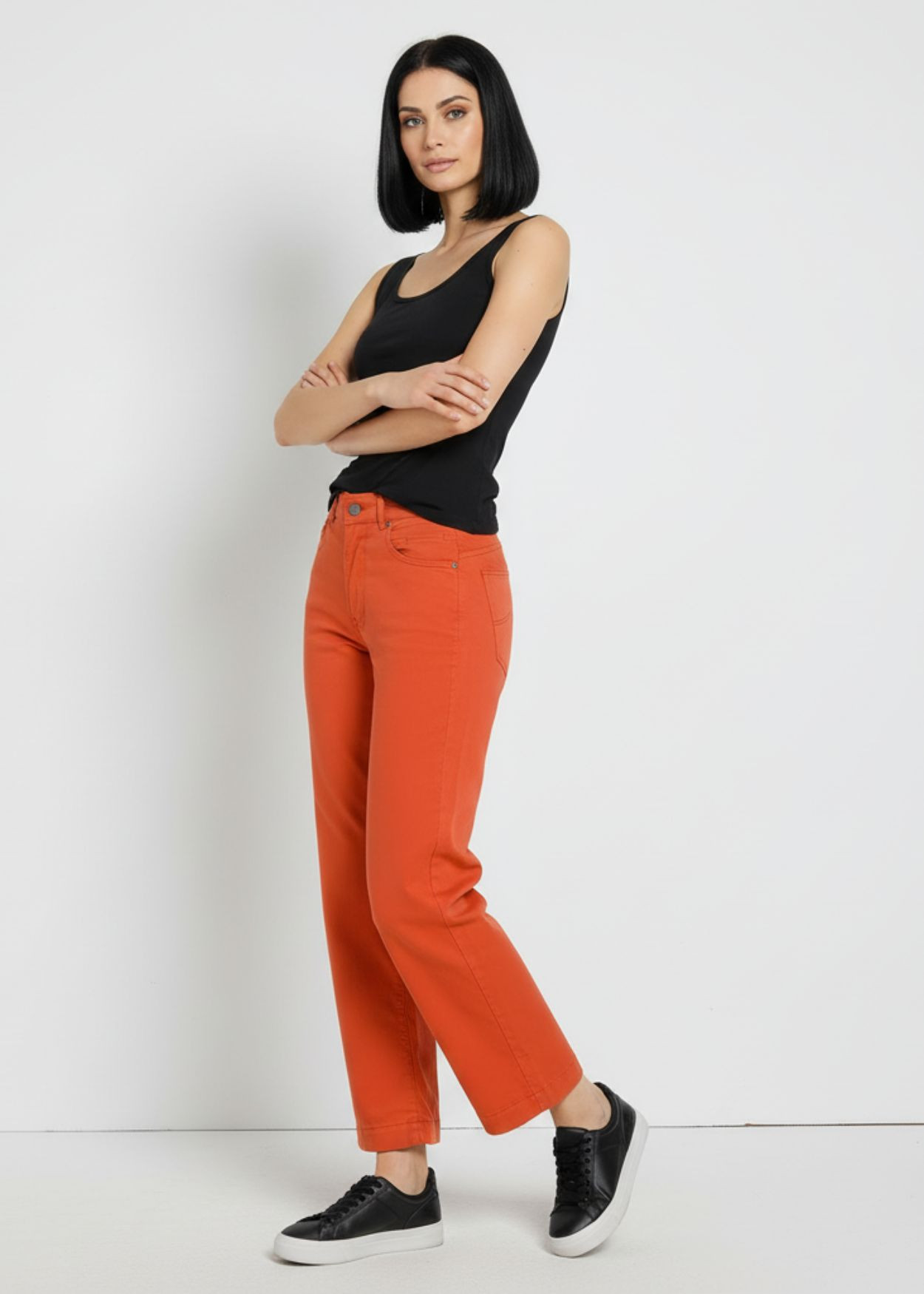 La nuance Pêche, un orange vibrant et plein de vitalité, insuffle une énergie nouvelle à vos tenues quotidiennes. C'est une couleur qui flatte le teint et permet de créer des contrastes saisissants avec des basiques neutres ou des imprimés printaniers. Bien que ce modèle soit également décliné dans des tons plus classiques comme le bleu, cette version colorée s'impose comme un choix fort pour exprimer sa personnalité. La coupe courte, s'arrêtant juste au-dessus de la cheville, est idéale pour mettre en valeur vos chaussures préférées, des baskets minimalistes aux sandales plus sophistiquées.